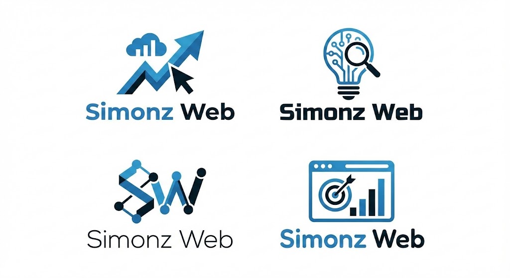 「Webメディアのロゴを作成してください。テーマは『Webマーケティング』色はブルーと黒を基調に、シンプルかつフラットなデザインで。文字は『Simonz Web』と入れてください」背景は白でお願いします。4つ同時に作成